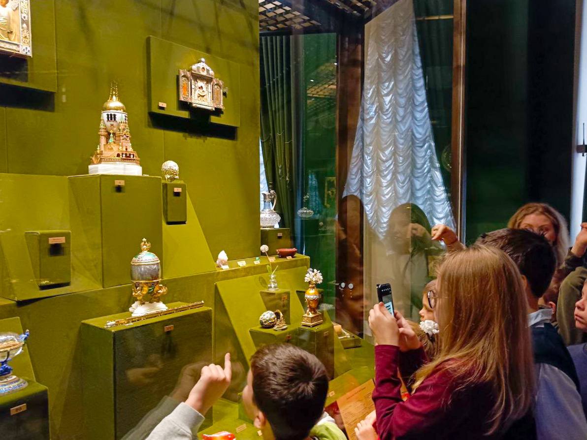 Затем все отправились в Оружейную палату. Оружейная палата — музей-сокровищница — является частью комплекса Большого Кремлевского дворца. Она размещается в здании, построенном в 1851 году архитектором Константином Тоном. Основу музейного собрания составили веками хранившиеся в царской казне и патриаршей ризнице драгоценные предметы, выполненные в кремлевских мастерских, а также полученные в дар от посольств иностранных государств. Своим названием музей обязан одному из древнейших кремлевских казнохранилищ. Там ребята встретились с произведениями оружейного искусства — саблями и мечами, рыцарскими доспехами и другими сокровищами.