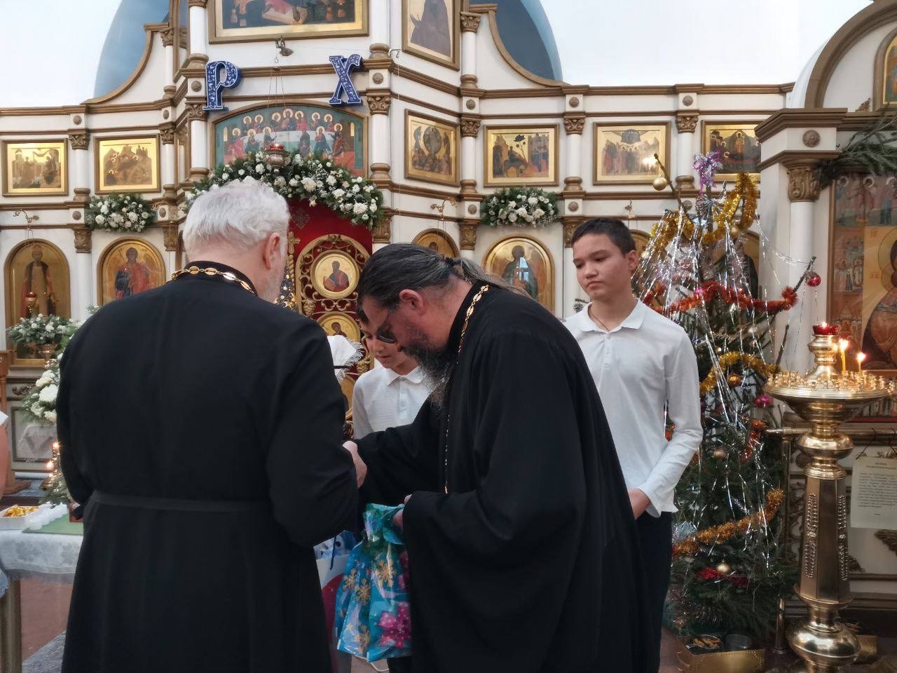 После концерта отец Виктор и отец Александр поздравили всех с праздником и вручили детям рождественские подарки. Затем все отправились на трапезу.