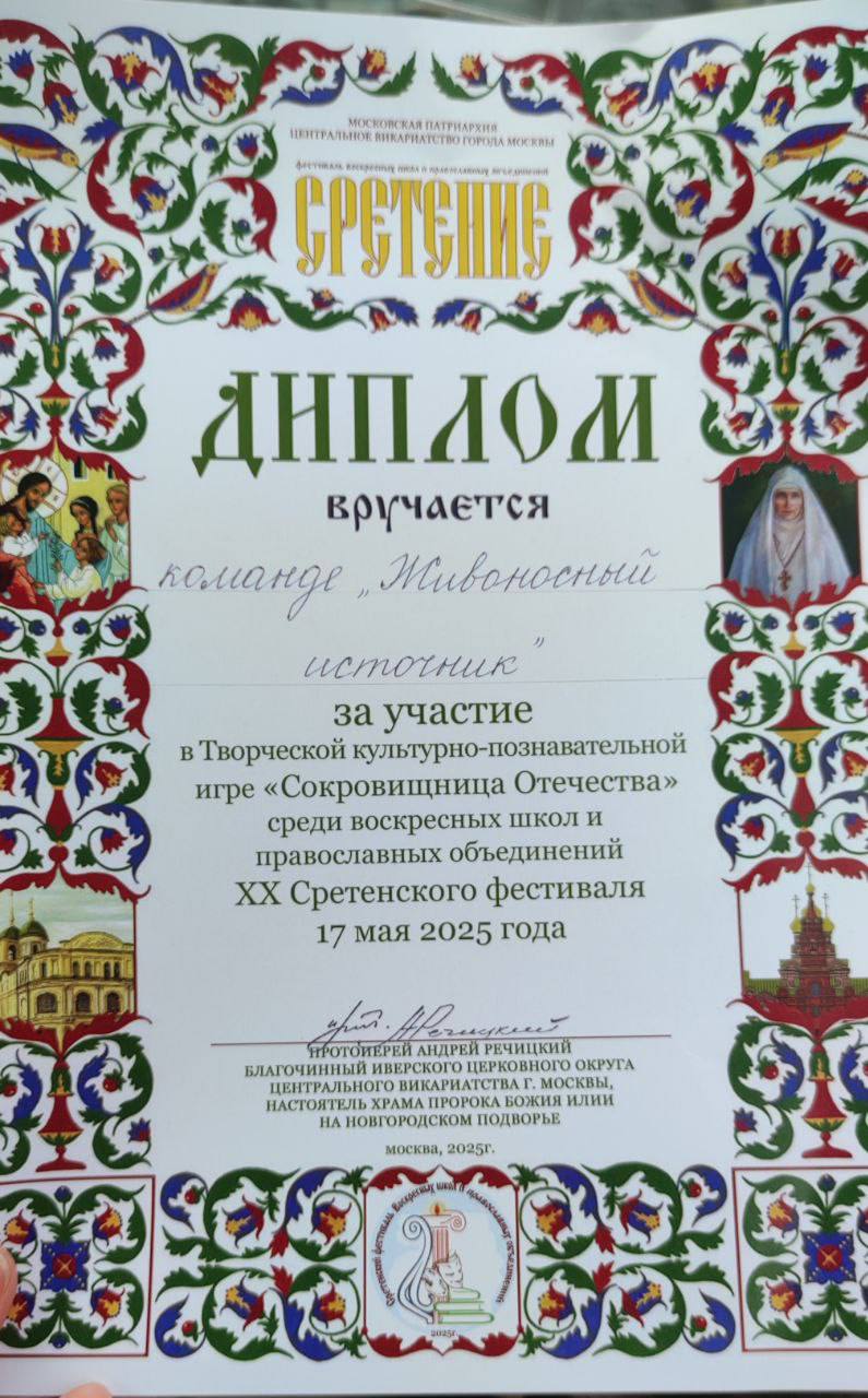 17 мая 2025 года воспитанники Воскресной школы при нашем храме приняли участие в культурно-познавательной игре «Сокровищница Отечества», которая прошла в парке «Новослободский».